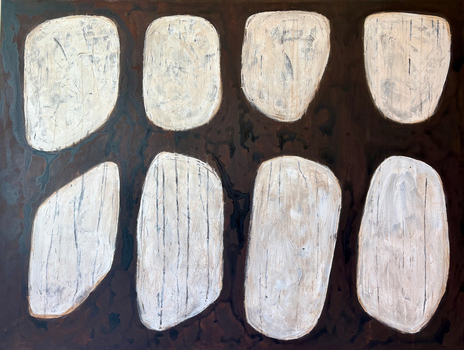 Pebble-like forms emerge against a rich chocolate brown backdrop, their surfaces scratched back and weathered - allowing glimpses of the darker tones beneath.
