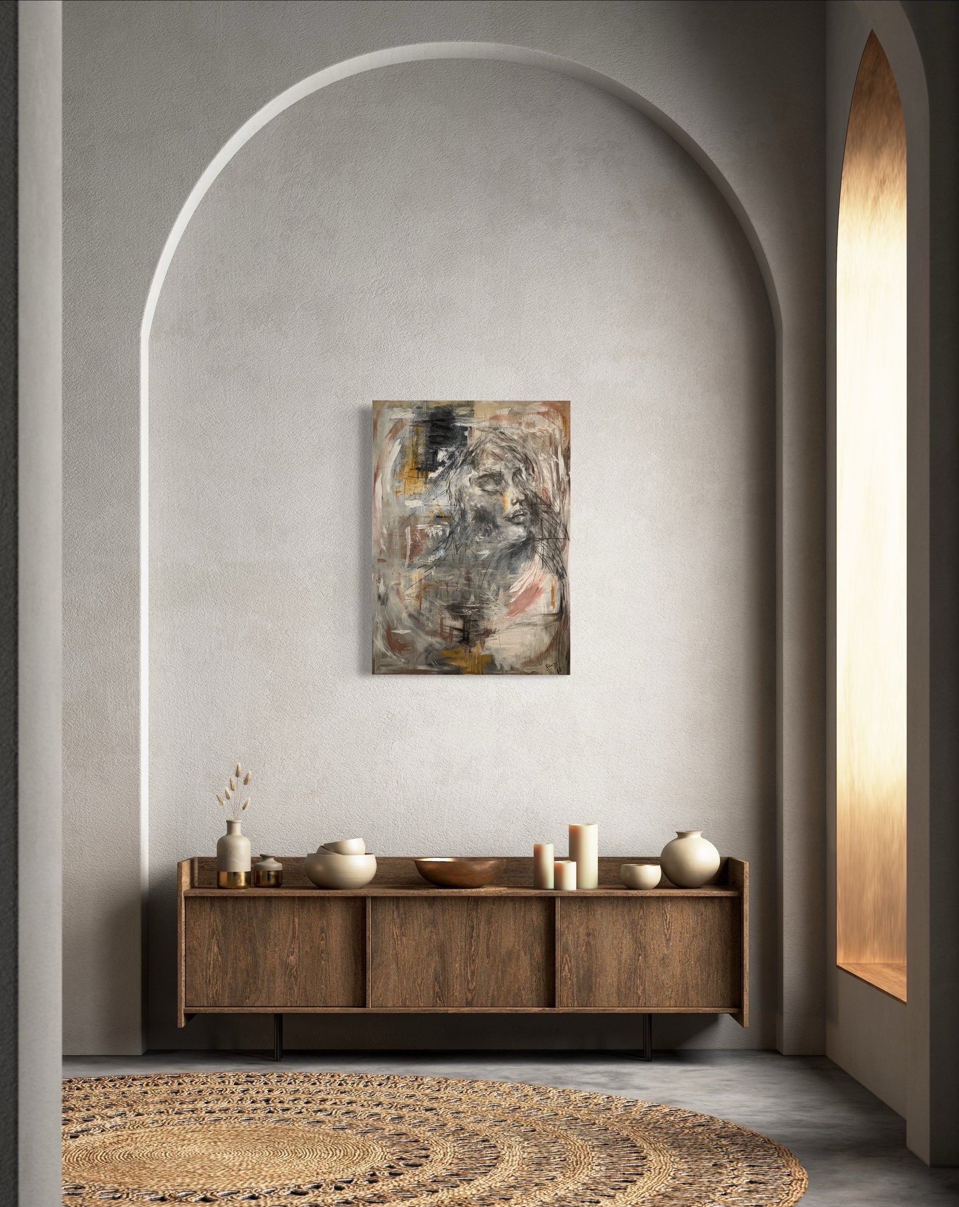 “Emerging” captures the quiet strength of a figure surfacing from layers of abstraction. Soft contours of a face rise through sweeping textures and earthy tones, suggesting a moment of stillness within movement.