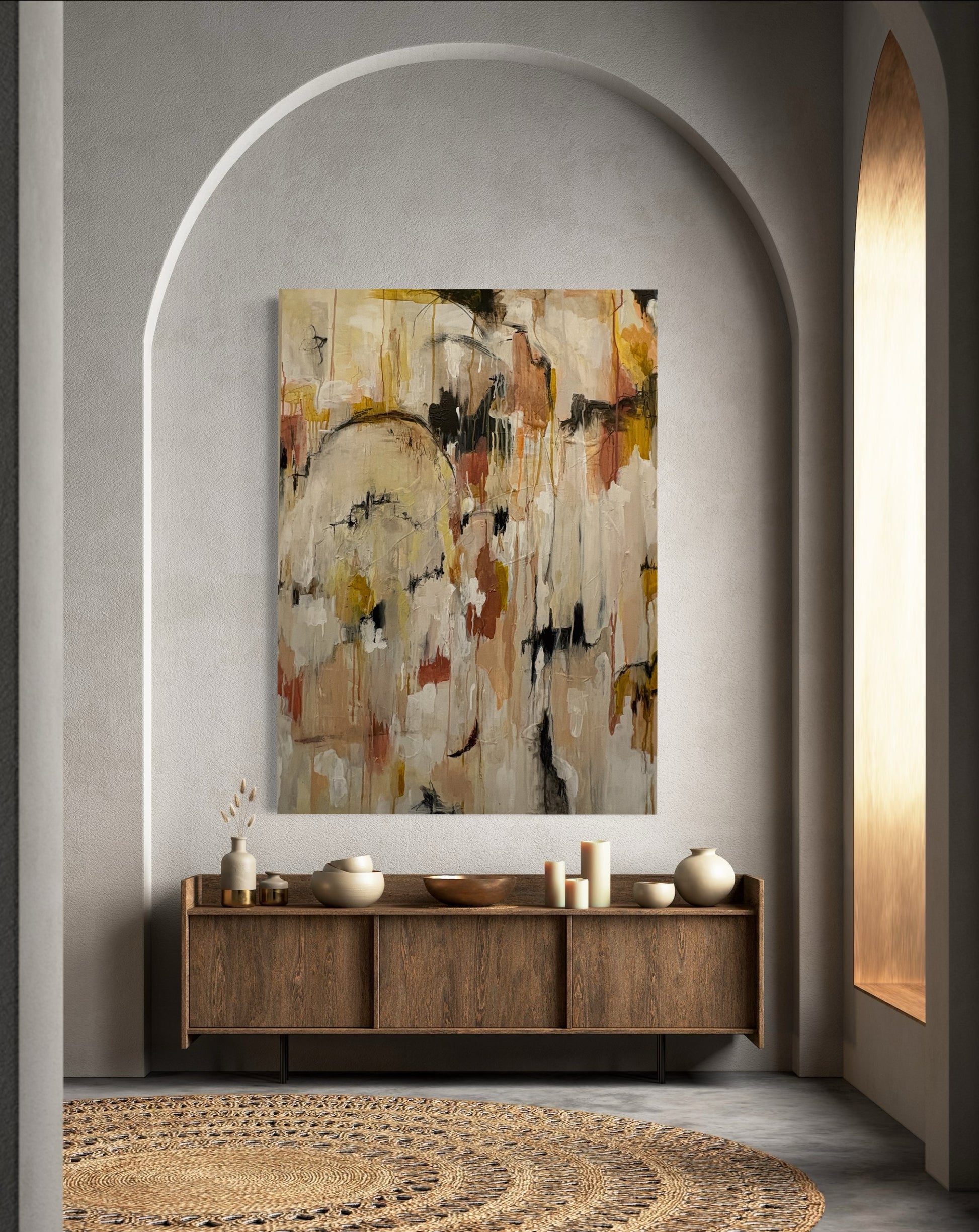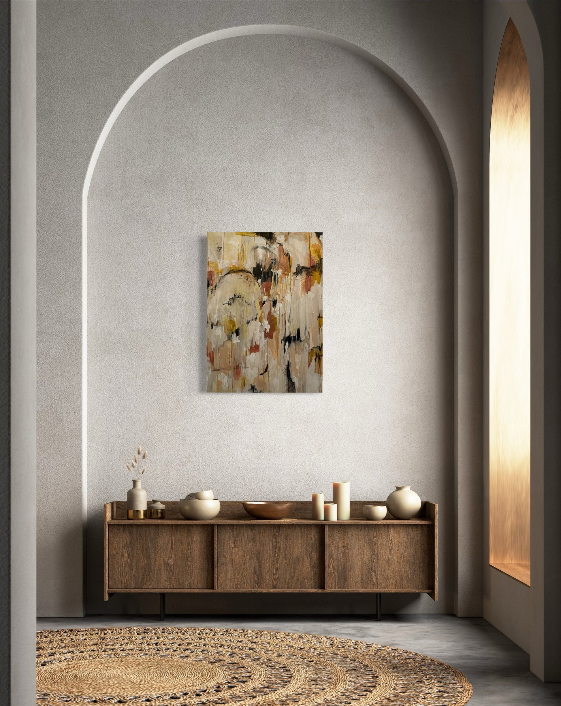 The painting balances structure with spontaneity - the suggestion of natural forms emerging through layers of abstraction. It reflects the quiet beauty of landscapes transformed by weather, where the line between sky and earth becomes fluid and where impermanence reveals a deeper sense of stillness.