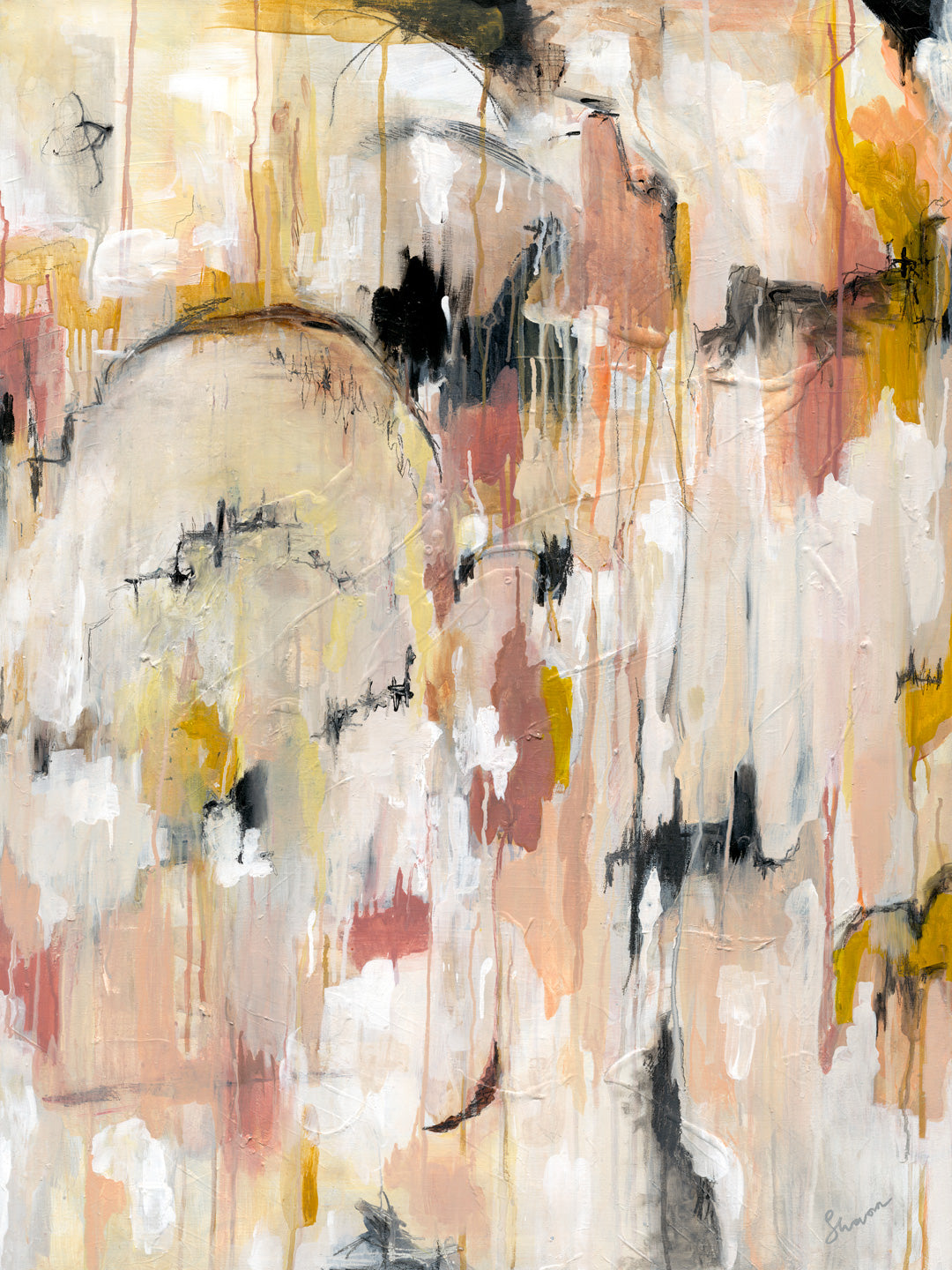 The composition is layered with warm ochres, blush pinks and muted creams - contrasted by bold strokes of black and gold that move like fleeting shadows across the terrain. Vertical drips and fluid marks evoke the sensation of rainfall, blurring boundaries and softening edges, as if the hills themselves are dissolving into atmosphere.